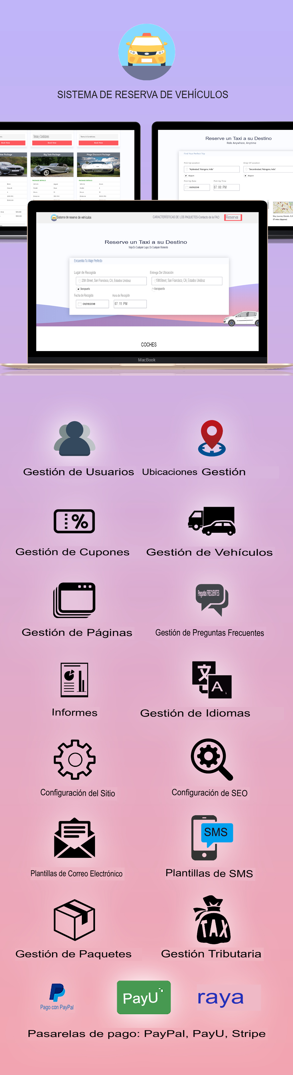 software excepcional para la reserva de vehículos, taxis y coches. Desarrollado con el potente y ligero framework PHP CodeIgniter, además de un excelente soporte y una atención al cliente amable.